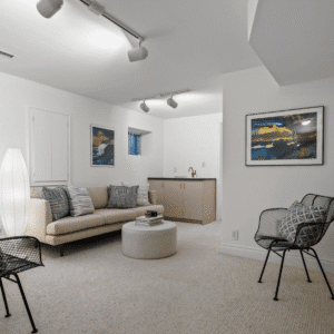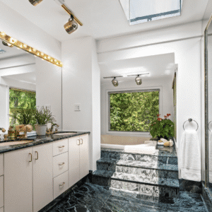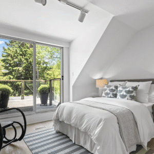 The lower level features generous ceiling heights (7’4″), a recreation area, ample storage, and a guest bedroom with a cedar-lined closet. Outside, the newly replaced rear deck leads to a peaceful garden surrounded by mature greenery and a blossoming Japanese cherry tree.