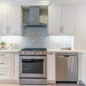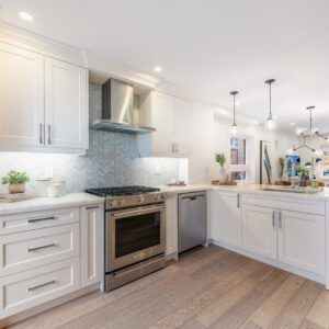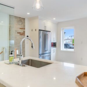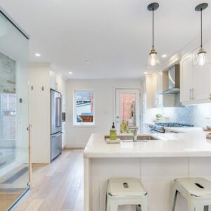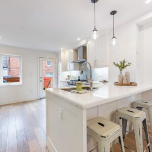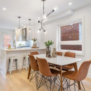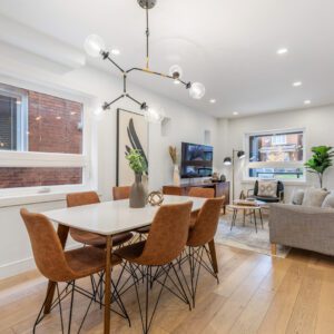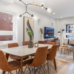 The chef-inspired kitchen, often sought-after by Toronto homebuyers, dazzles with its sophisticated Carrera marble countertops and a captivating herringbone backsplash. Modern living is accentuated by state-of-the-art stainless steel appliances, making it a centrepiece in Toronto luxury properties. Enjoy casual moments at the countertop overhang or appreciate the warmth of the adjacent exposed brick feature.
