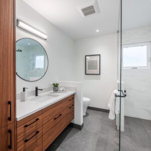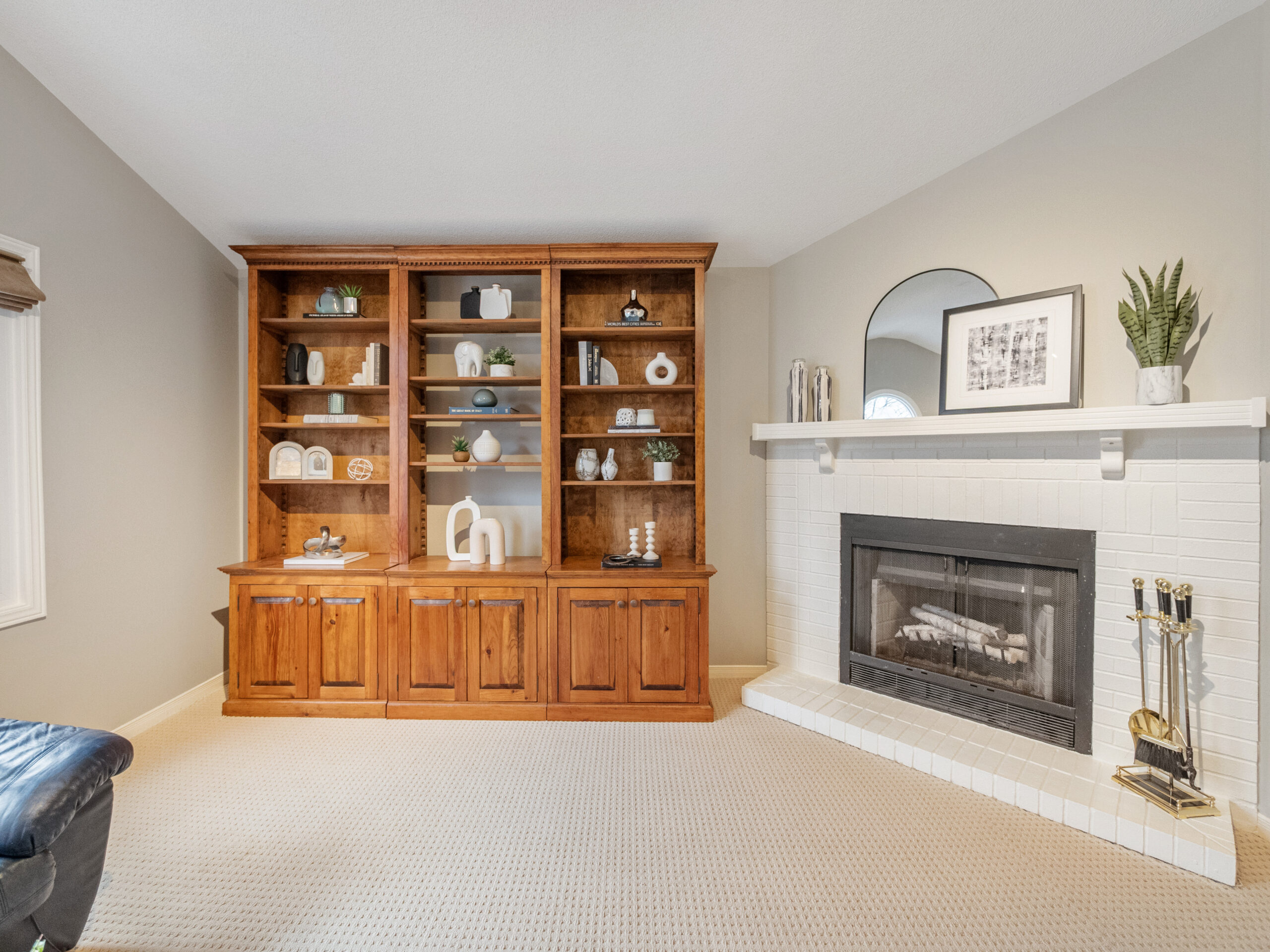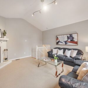Just a few steps up, a cozy living room anchored by a wood burning fireplace offers a warm and inviting retreat. It is the perfect place to unwind at the end of the day and truly feels like an escape within your own home.