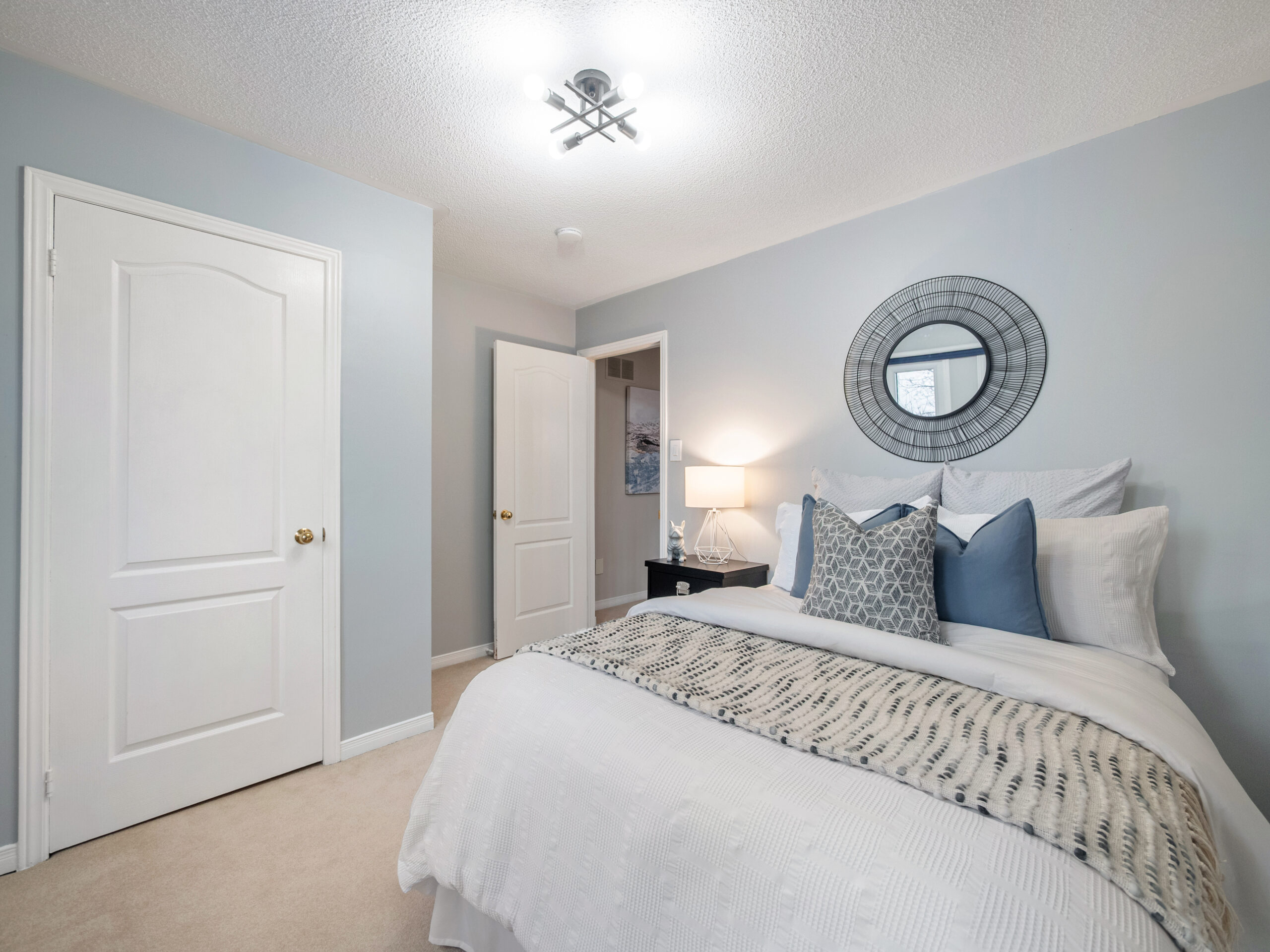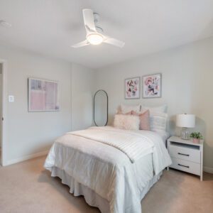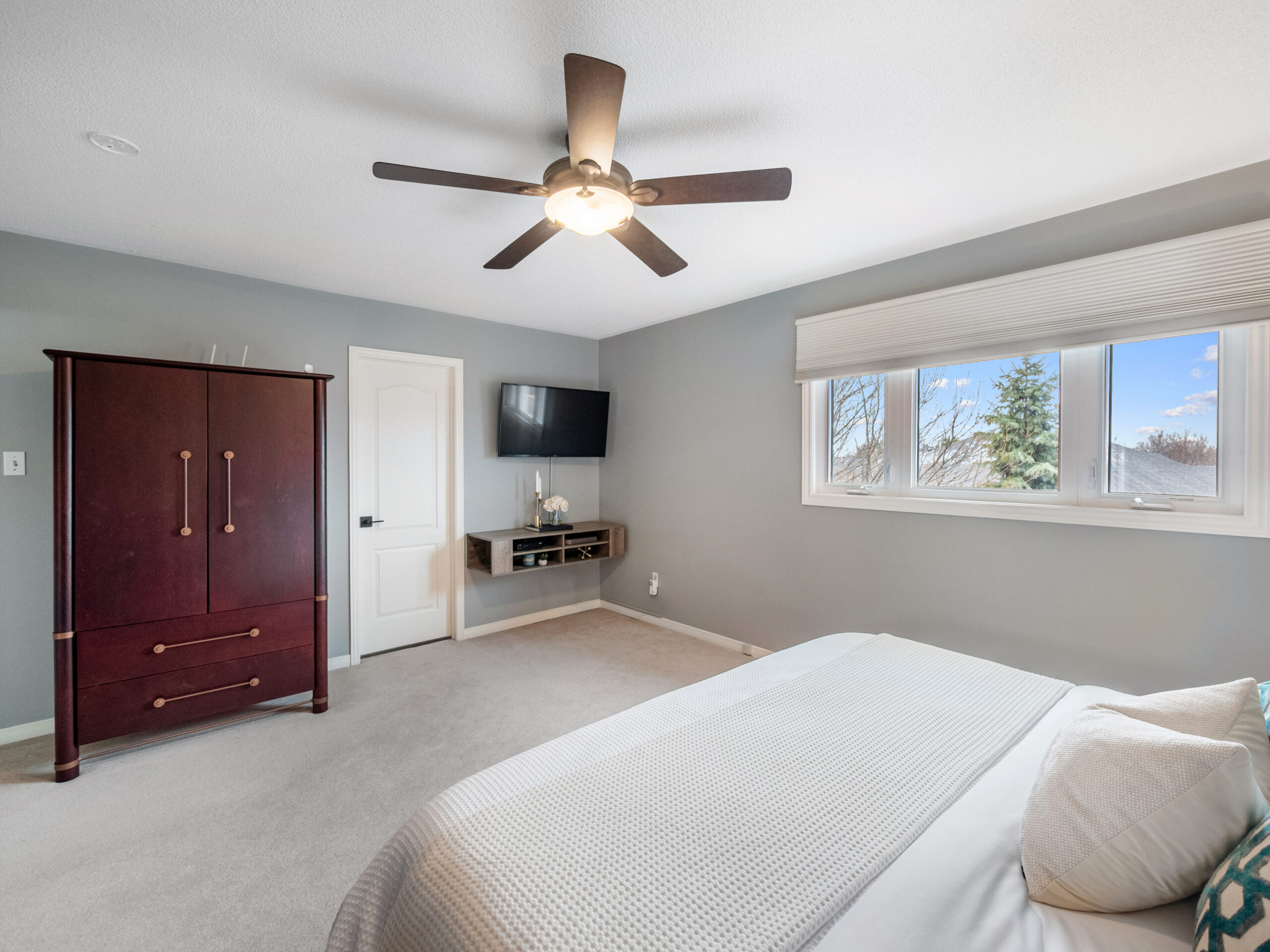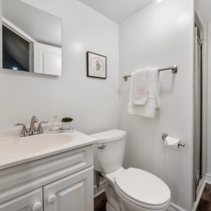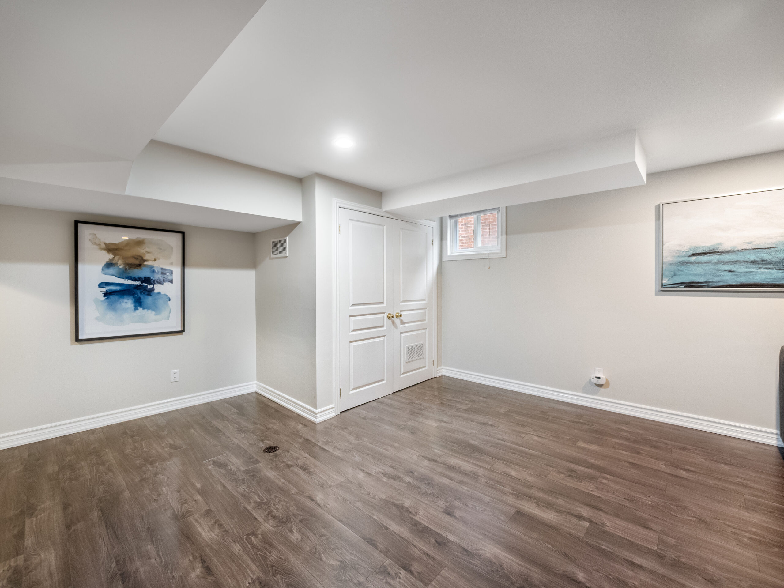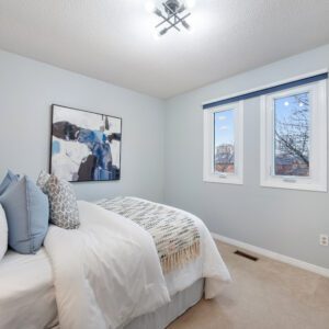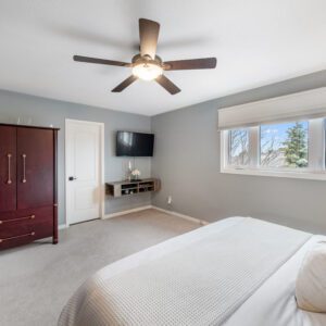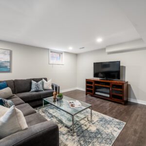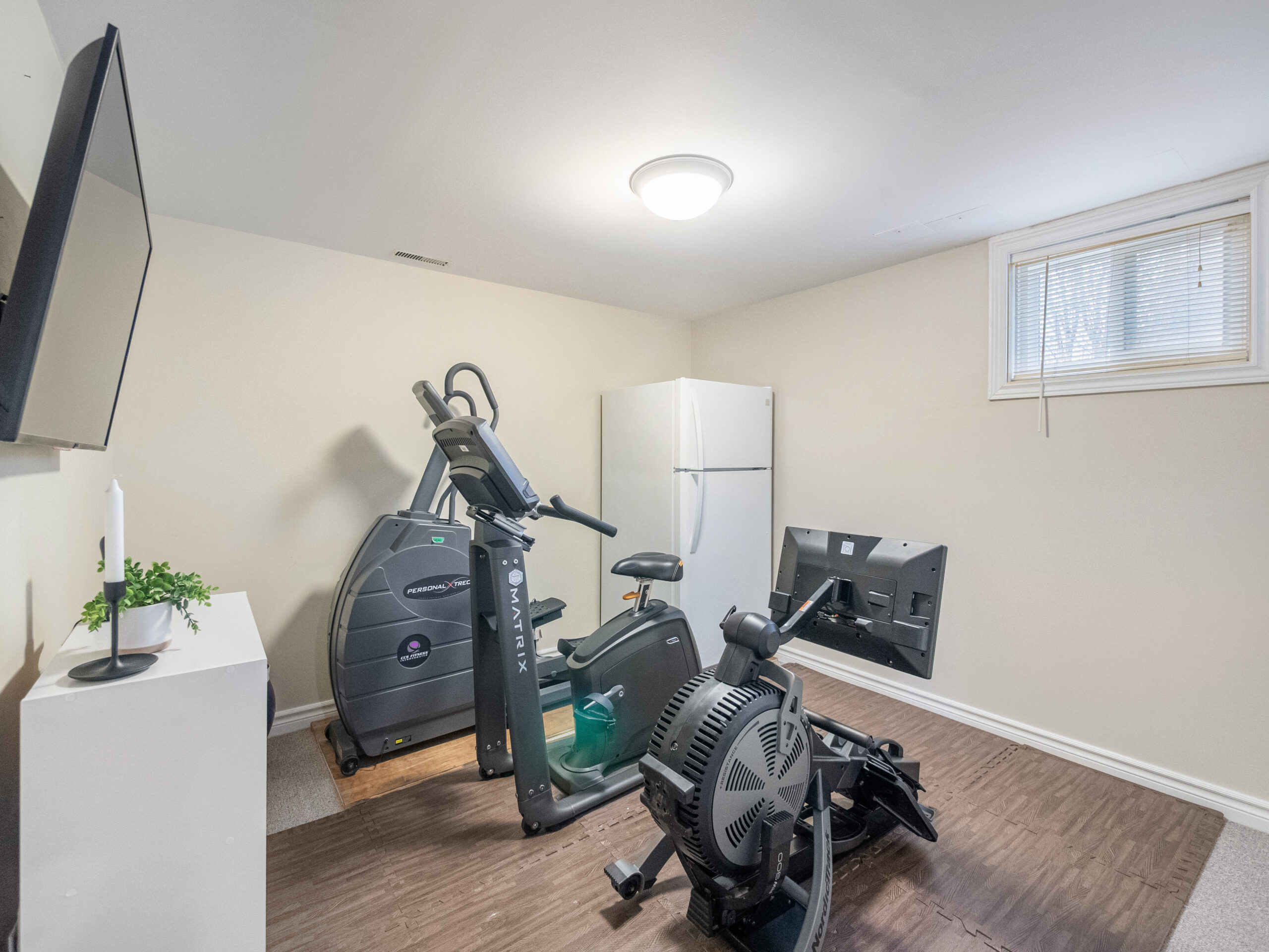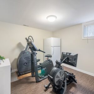 The finished lower level provides excellent versatility with an additional bedroom and bathroom. Currently used as a home exercise room, the space can easily adapt to suit a variety of needs, whether for guests, a home office, or recreation area.