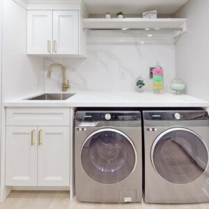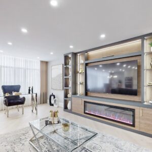 The 6-piece primary ensuite is a sanctuary of relaxation, featuring a freestanding tub, an oversized walk-in shower, a double sink custom vanity with Riobel faucets, and the comfort of heated floors. The attention to detail extends to custom built-in closets and a large custom media center with a fireplace, ensuring that every aspect of this home exudes elegance and comfort.