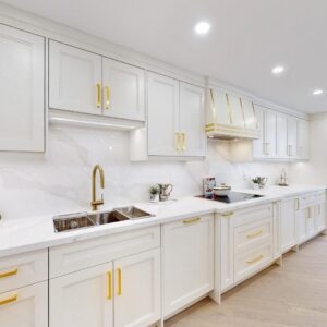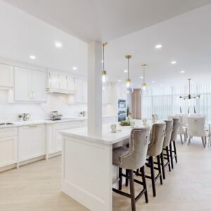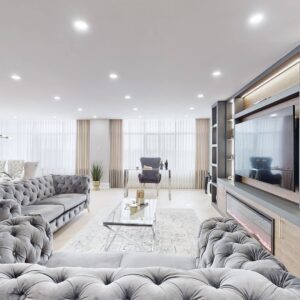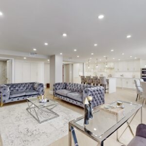 The engineering hardwood flooring throughout seamlessly blends with the smooth ceilings, LED pot lights, and sophisticated European design electric light fixtures, creating an ambiance of modern luxury.